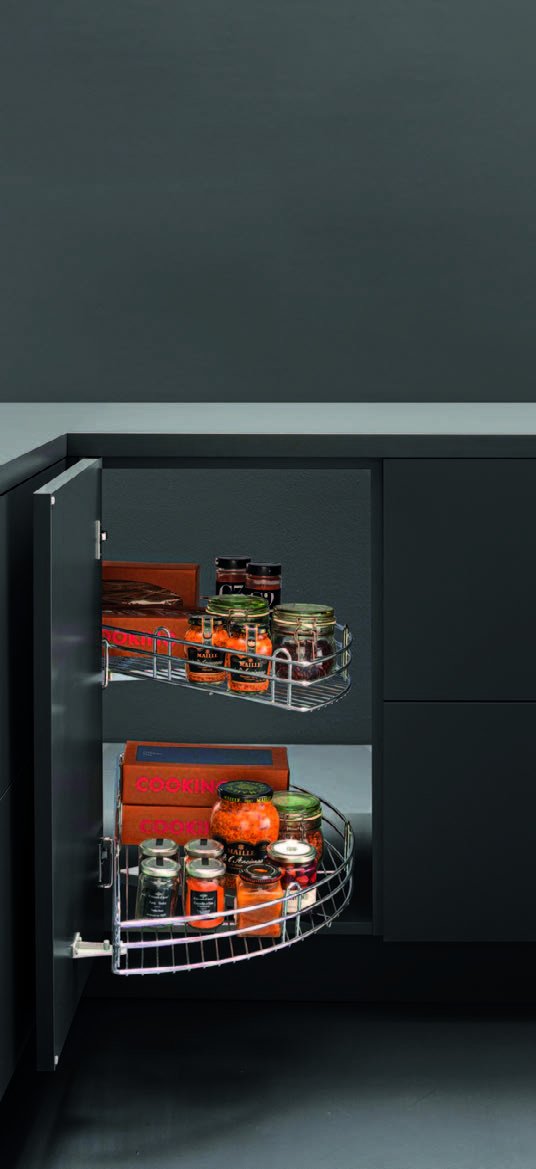 Ещё одна новинка от VIBO — комплект поворотных полок в угловой шкаф. Помимо пятислойного гальванического покрытия, обеспечивающего изделиям высокое качество и отличную устойчивость к коррозии, заслуживает особого внимания компактность и функциональность конструкции. Полки крепятся непосредственно к фасаду и выдвигаются с открытием дверцы шкафа. Преимущество комплекта состоит и в том, что полки можно установить на любой высоте независимо друг от друга.