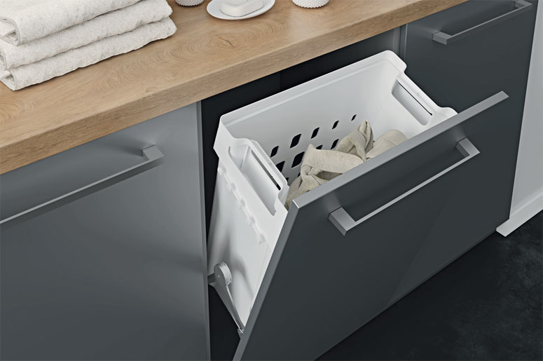 Корзины Laundry имеют перфорированный пластиковый каркас, что обеспечивает свободную циркуляцию воздуха в ёмкости и лёгкость конструкции. Подходят для установки в нижние базы шкафов шириной 450 и 500 мм. В соответствии с имеющимся пространством можно выбрать корзины объёмом 40 л (глубина — 222 мм) или 50 л (глубина — 307 мм). Детали крепления к фасаду входят в комплект поставки.