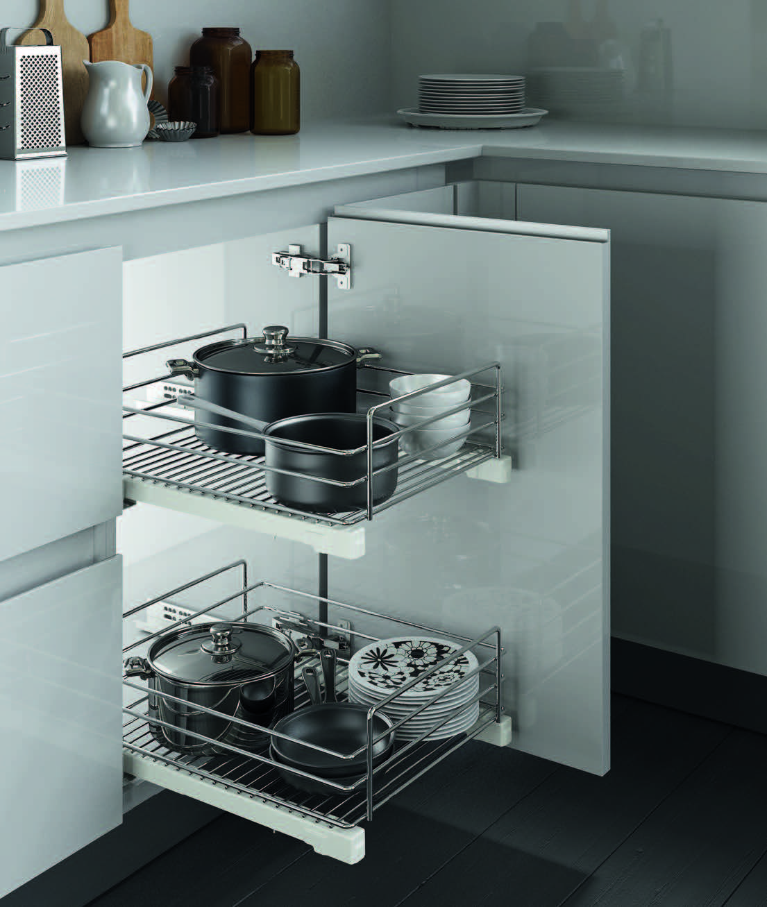 Корзины комплектуются направляющими Salice Guide частичного выдвижения, используются как в нижних базах 450 и 600 мм, так и в вертикальных колоннах той же ширины. Хотя сетки снабжены двумя расширителями (левым и правым), при монтаже используется только один из них. Расширитель устанавливается на ту сторону каркаса, где закреплён распашной фасад. В результате при выдвижении сетка не упирается в петлю или дверцу. Необходимая глубина каркаса для установки сеток составляет не менее 470 мм. Максимальная нагрузка на одну сетку — 20 кг. Новинка уже доступна в складской программе MAKMART по очень привлекательной цене.