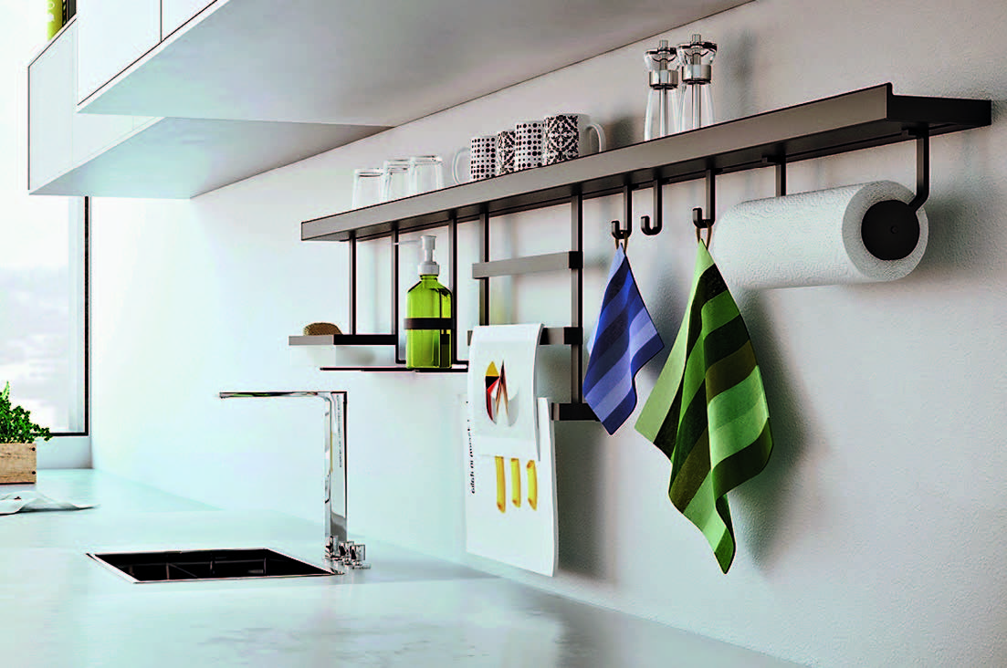 В комплект рейлинговой системы Horizon Big входят такие аксессуары, как крючки, держатели для диспенсера, держатели для полотенец, а также многофункциональная полка с цельным дном.