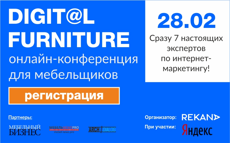 На большой онлайн-конференции DIGITAL FURNITURE, которая состоится 28 февраля с 11:00 до 18:30 (MSK), сразу 7 признанных экспертов по интернет-маркетингу расскажут о диджитал-трендах 2019 года, новостях цифровой реальности, эффективных кейсах и инструментах онлайн-продвижения мебельных компаний, ответят на вопросы слушателей-участников. Не просто digital, а МЕБЕЛЬНЫЙ DIGITAL! Журнал «Мебельный бизнес» выступает информационным партнёром онлайн-конференции.